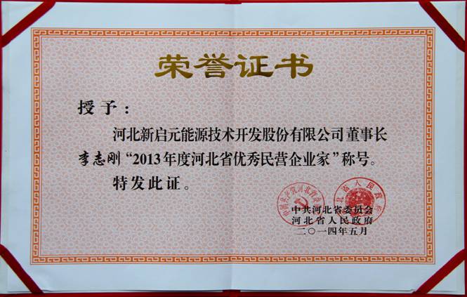 6月5日,中共河北省委、河北省人民政府授予新啟元公司“河北省2013年度百強(qiáng)民營企業(yè)”榮譽稱號。授予新啟元公司董事長李志剛“2013年度河北省優(yōu)秀民營企業(yè)家”榮譽稱號。
