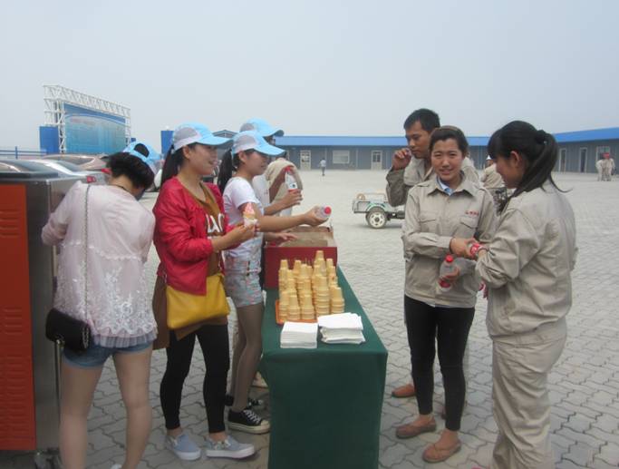 根據(jù)董事長提出的“集聚激情、 亮出真情、 體現(xiàn)親情”的口號(hào), 6月17日一早,華悅凱旋大酒店經(jīng)過細(xì)致安排,選派精干員工,在酒店副總經(jīng)理孫軍和施艷帶領(lǐng)下,到新欣園施工現(xiàn)場(chǎng)進(jìn)行慰問,將一瓶瓶滿懷敬意的礦泉水送到建設(shè)者們的手中,并現(xiàn)場(chǎng)制作冰激凌,給建設(shè)者帶去一絲絲“溫暖 ”的涼意,全體員工共祝新欣園生日快樂。