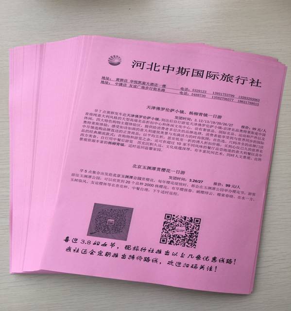 春季正是花開柳綠、服裝換季的季節(jié),旅行社全體成員談討研究,在三月份每周推出特價旅游團,北京玉淵潭公園賞櫻花一日游,天津佛羅倫薩小鎮(zhèn)、楊柳青古鎮(zhèn)休息購物一日游,為黃驊、中捷百姓提供一個踏青賞花、游、購、娛的服務平臺。